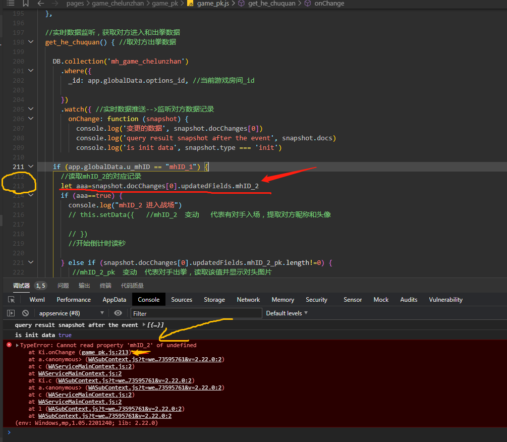 如下图所示:我想在实时推送的监听结果里,判断 mhID_2是不是存在,如果不存在就跳过,存在就读取mhID_2的内容。如下的语法系统提示错误,我应该怎么写才能达到判断的目的呢?