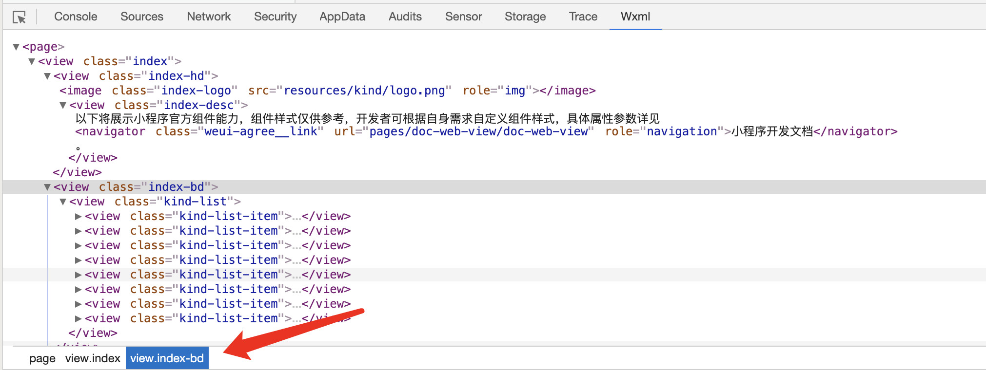 如上,可以知道 tagName 是 view,class 是 index-bd