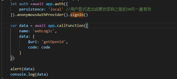 const cloud = tcb.init({ env: "环境id" }); const auth = cloud.auth({ persistence: "local" }); let state = await auth.getLoginState().then(state => { if (!state) { return auth.signInAnonymously().then(result => { console.log(result); return result; }); } else { console.log(state); } return state; });