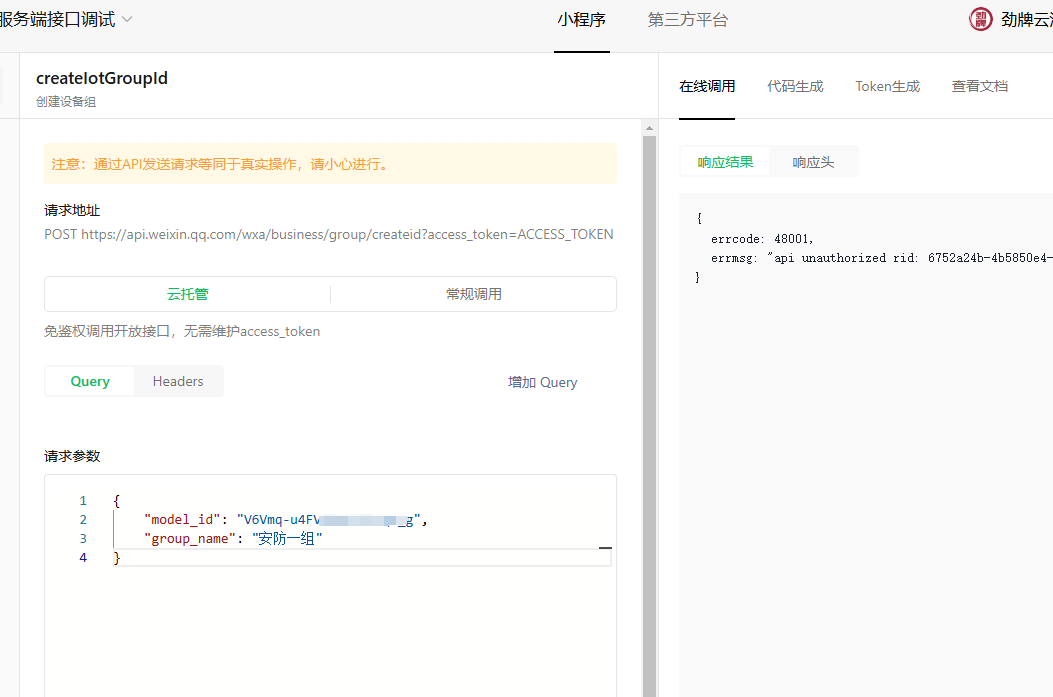 想着需要创建设备组,才能发送设备消息,后面尝试直接先获取票据:snticket,再通过小程序发送订阅,然后发送设备消息,是可以的,以至于为什么创建设备组没法创建,具体没搞清楚,用发送设备消息成功的token再去请求创建设备组还是报错