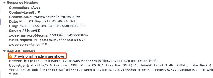 用开发者工具调度uploadFile的时候,无论是否成功,request Header里总是提示Provisional headers are shown。无论上传到那里都是,用postman的话就不会。但是这样的话对于调试就有点不利了,如果想看请求里的所有数据是否正确的话还需要使用抓包工具。有伙伴遇到这种情况吗?