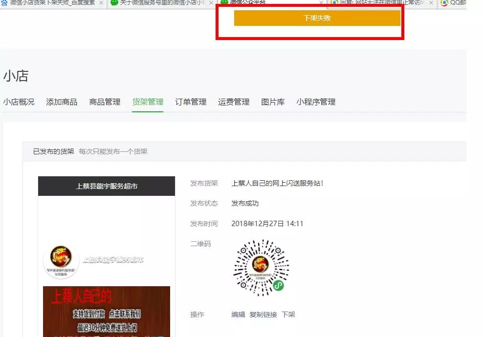 你好,我的微信小店货架下架失败,公众号名称“上蔡县龍宇服务超市”,公众号ID:gh_2ea65a20a3d5,货架无法下架,一直提示下架失败,新建货架无法上架,麻烦帮忙看下什么原因?谢谢了