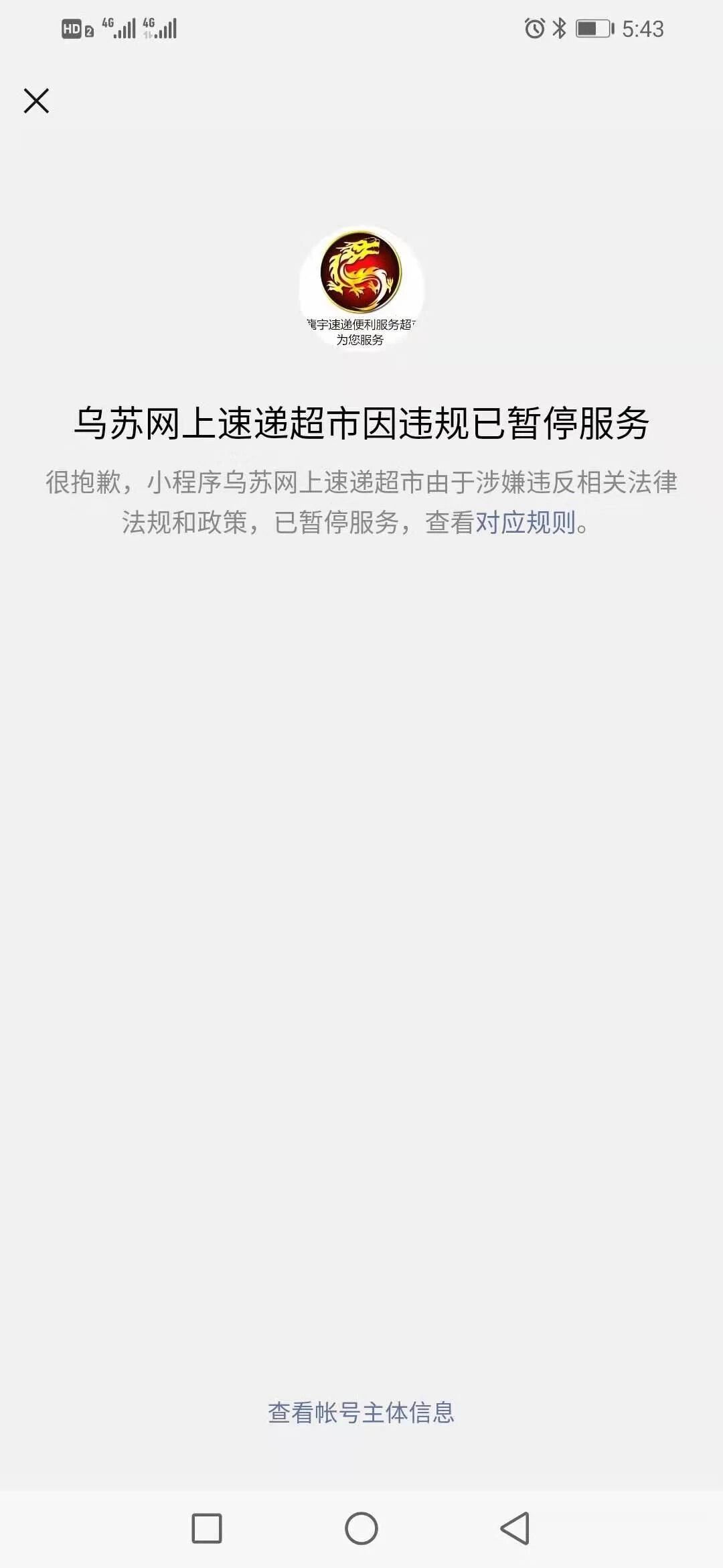 打开微信小店小程序提示:乌苏网上速递超市因违规已暂停服务,