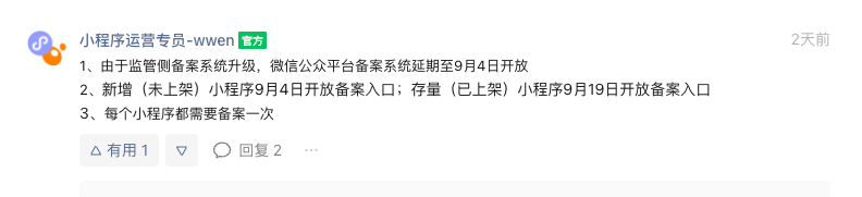 新增(未上架)小程序9月4日开放备案入口;存量(已上架)小程序9月19日开放备案入口。