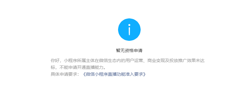 你好,申请开通直播被提示“你好,小程序所属主体在微信生态内的用户运营、商业变现及投放推广效果未达标,不能申请开通直播能力。”