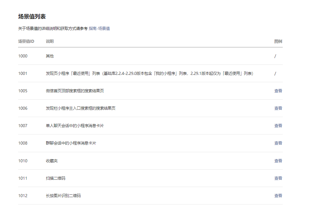 如下图1,小程序对于每个场景值ID有具体的说明。如下图2(访问分析),每个场景值ID应该是有对应的一二级来源名称。请问官方有没有小程序场景值ID对应的一级二级类目表?