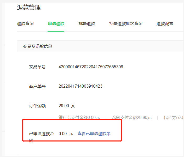 第二种情况,调用成功,请求参数中退款金额也是2900,但是支付中心显示申请退款0元