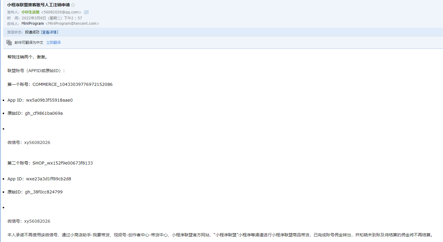 本人承诺不再使用该微信号,通过小商店助手-我要带货、视频号-创作者中心-带货中心、小程序联盟官方网站、“小程序联盟”小程序等渠道进行小程序联盟商品带货,已完成账号佣金转出,并知晓未到账及待结算的佣金将不再结算。