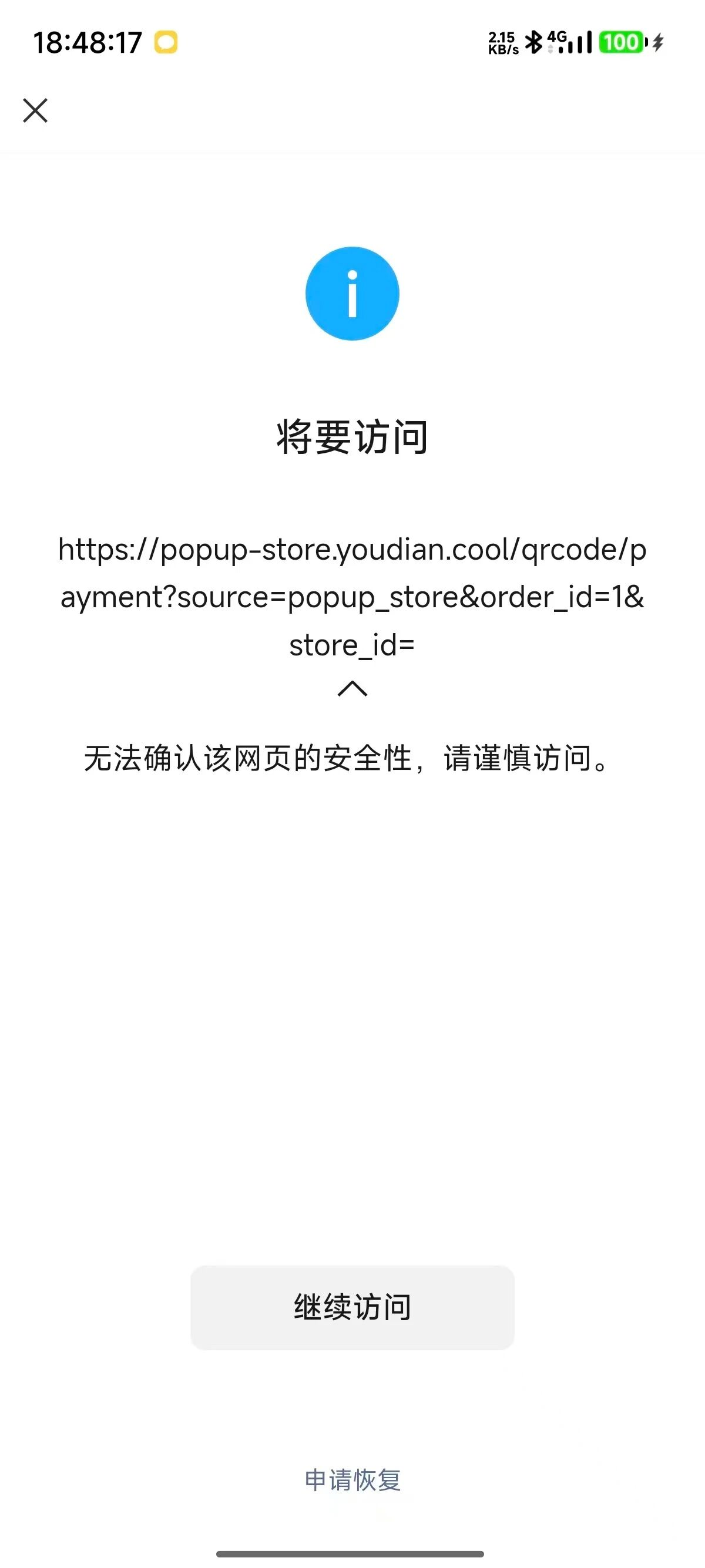 测试二维码地址:https://popup-store.youdian.cool/qrcode/payment?source=popup_store&order_id=1&store_id=