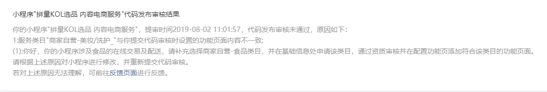 急问官方,我提交的小程序并没有涉及到商品的在线交易及配送,却被告知缺少电商平台类目,并且审核不通过。我的小程序关于商品的部分只是用来查看价格,并不涉及支付购买和配送