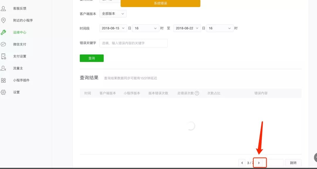 - 运维中心,错误查询,翻到下一页报“系统错误”,数据无法加载,如下图: