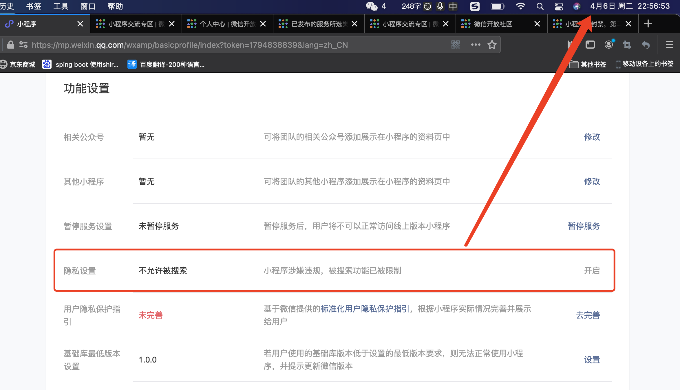 今天,2021年4月6号,在没有接到任何通知的情况下,小程序的被搜索功能又被禁止了。
