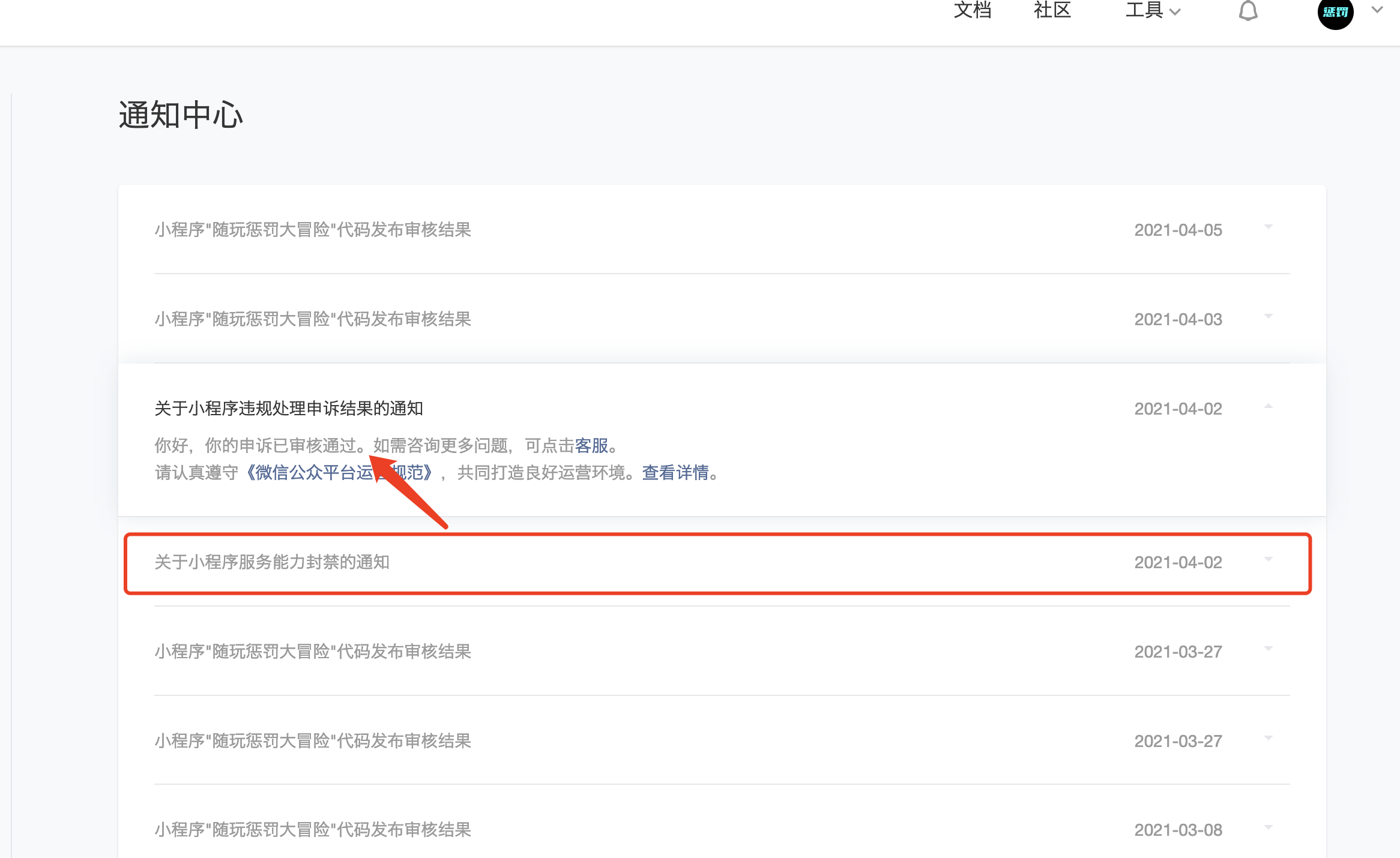 2021年4月2号小程序被封禁,然后通过申述,已经被解封了。见下图及 4月2号发的贴https://developers.weixin.qq.com/community/develop/doc/0000068efe06685affeb39c2456c00。