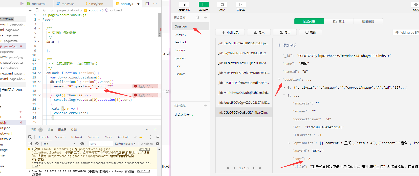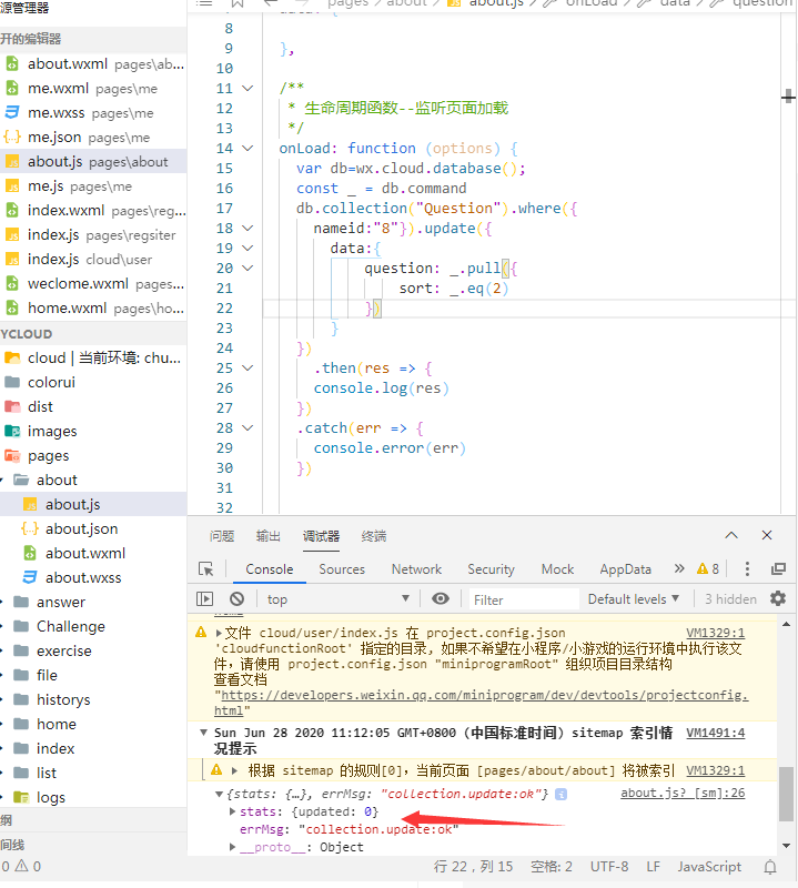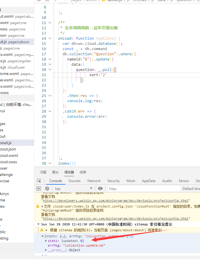 db.collection('Question') .where({ nameid: '8' }) .update({ data: { question: _.pull({ sort: '2' }) } })