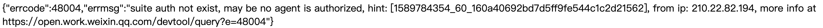 {"errcode":48004,"errmsg":"suite auth not exist, may be no agent is authorized, hint: [1681393934347280908488374], from ip: 101.200.240.11, more info at https://open.work.weixin.qq.com/devtool/query?e=48004"}