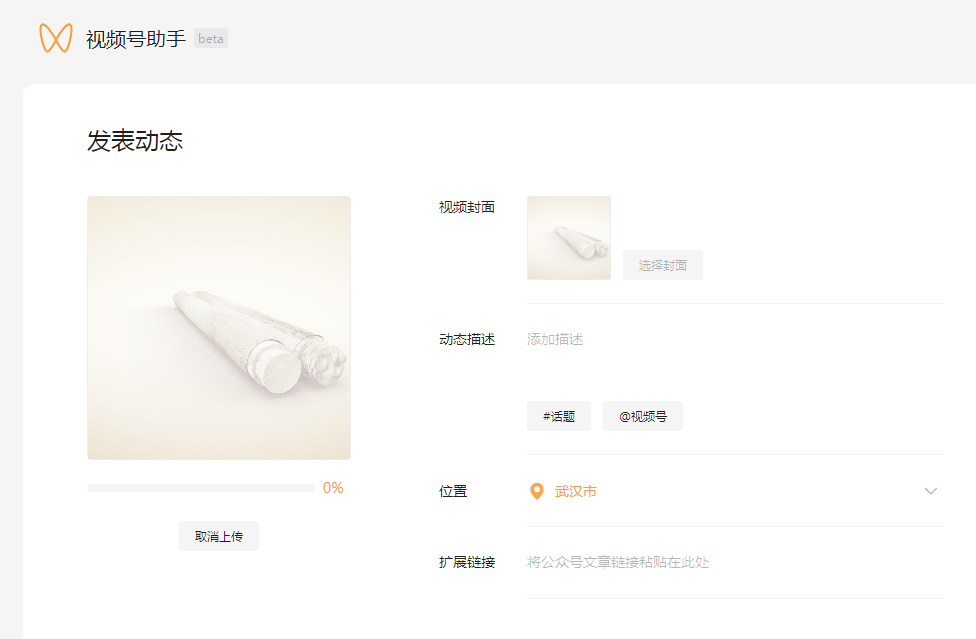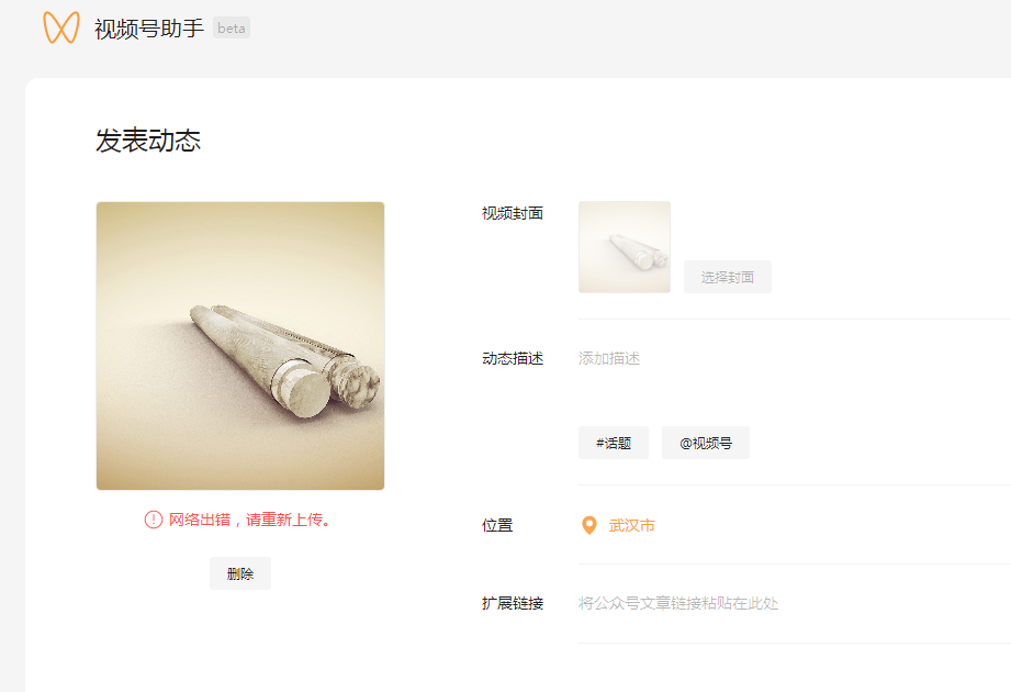视频号助手上传视频,选择视频后,上传进度条卡在0%不动,过一会儿后提示“网络出错,请重新上传”,更换浏览器、网络、设备均无果。