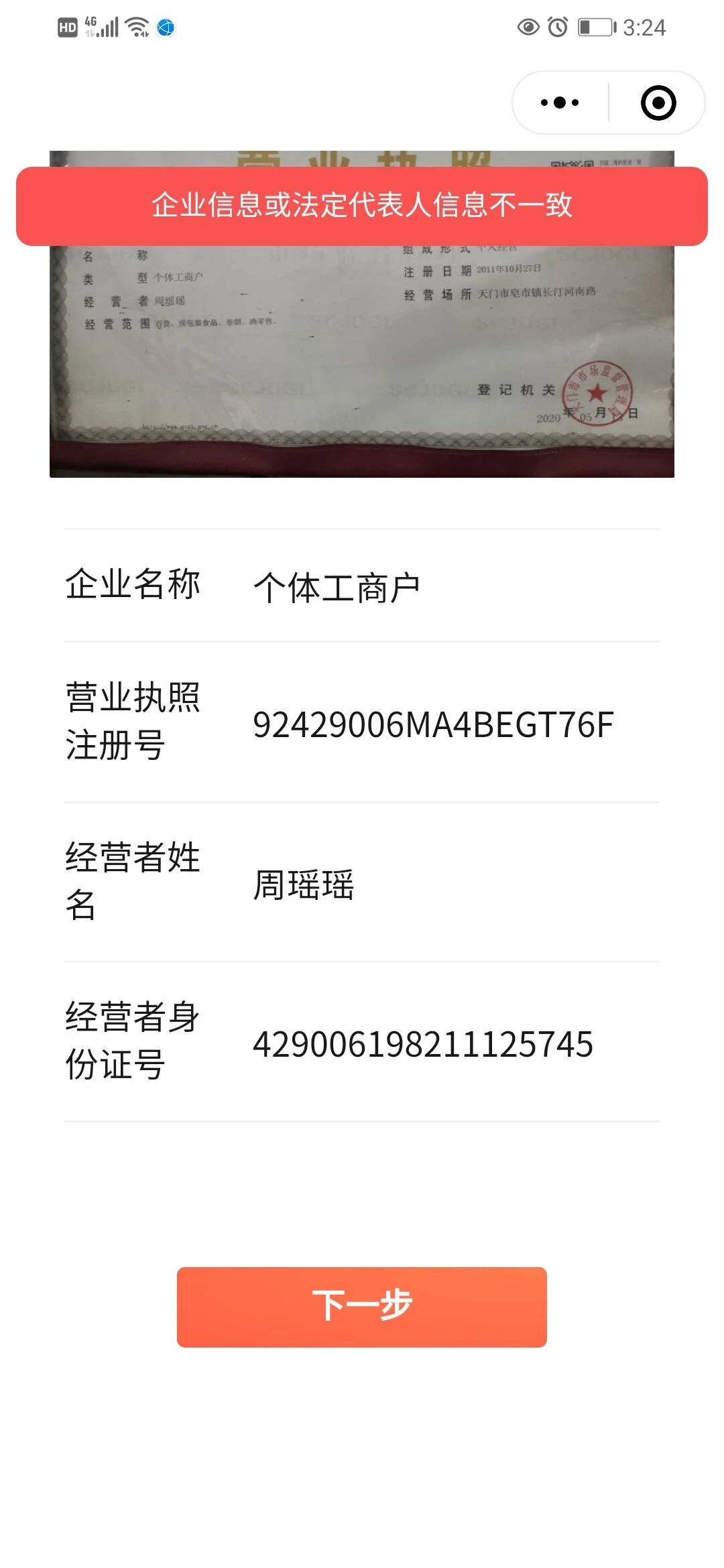 商家小程序上传营业执照显示“企业信息或法定代表人信息不一致”求回复并解决。