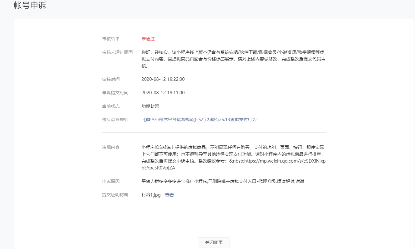 你好,经核实,该小程序线上版本仍含有预设/ps/pdf素材模板等虚拟支付内容,且虚拟商品页面含有价格标签展示,请对上述内容做修改,包含但不限于平台已发现违规内容,请开发者自查,完成整改后提交代码审核。