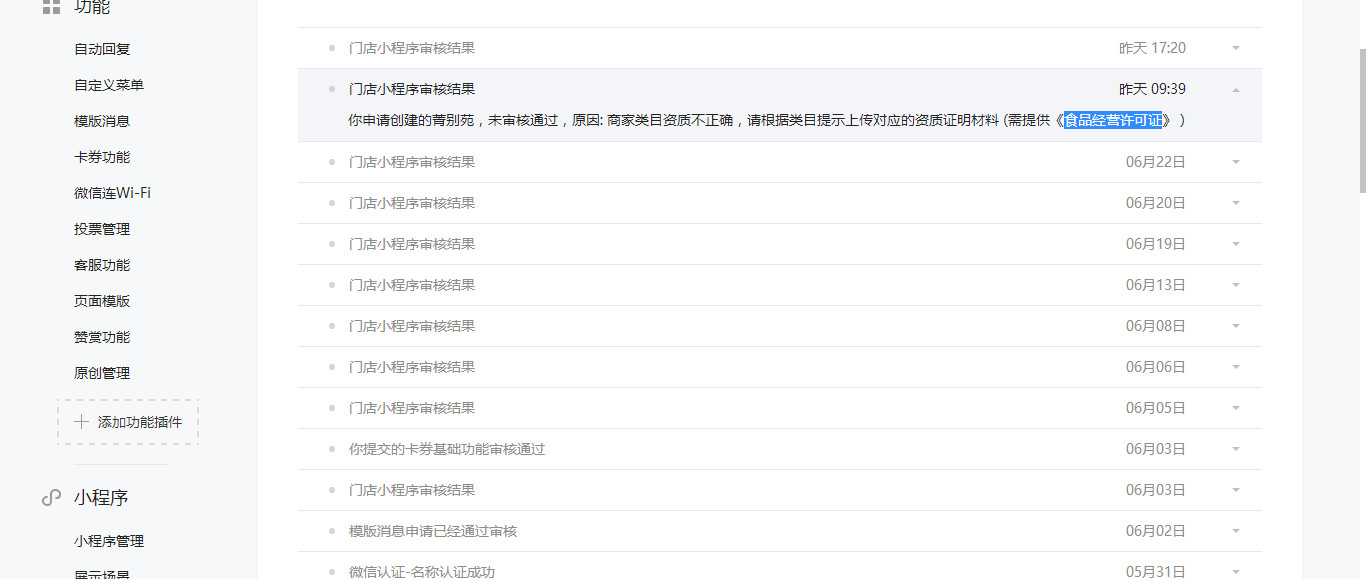 申请门店小程序十几次都不给通过,多次要求上传食品经营许可证,但我们只是小旅店,根本没有食品经营许可证,目前我们这就 有营业执照和卫生许可证。我们的小旅店想用wifi关注公众号功能,跪求大神帮忙处理一下,真的没办法了。我们试过类目青年旅馆、酒店等都不给。