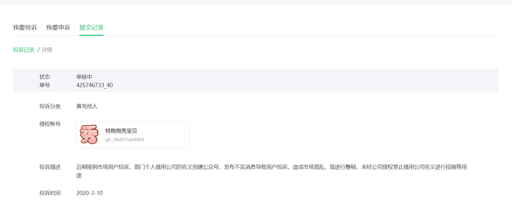 注:在投诉提交之后,平台审核之前,你可以通过如下途径撤销投诉:登录微信公众帐号平台后点击“侵权投诉”,选择“提交记录”栏目,找到对应投诉记录点击“详情”,在详情页点击“撤销投诉”,进行撤销投诉。