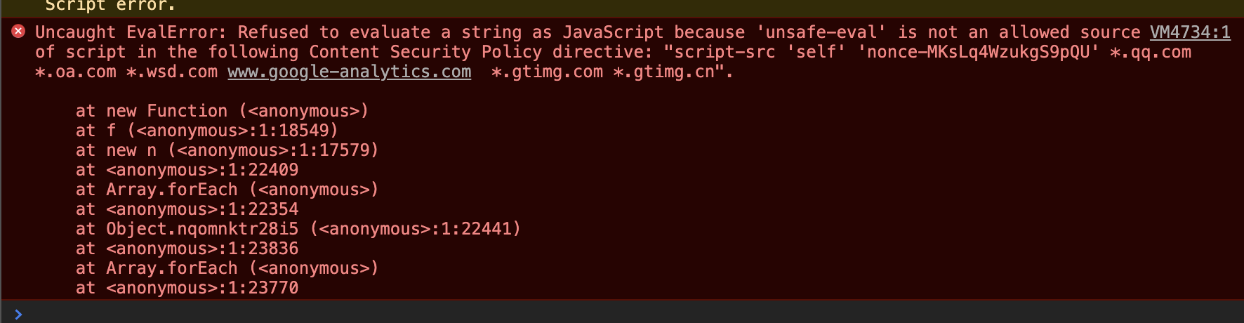 我给 script-src 添加了 'unsafe-eval' (其实我本不想这样做,希望能用 nonce-*的方式),出现了第二个报错