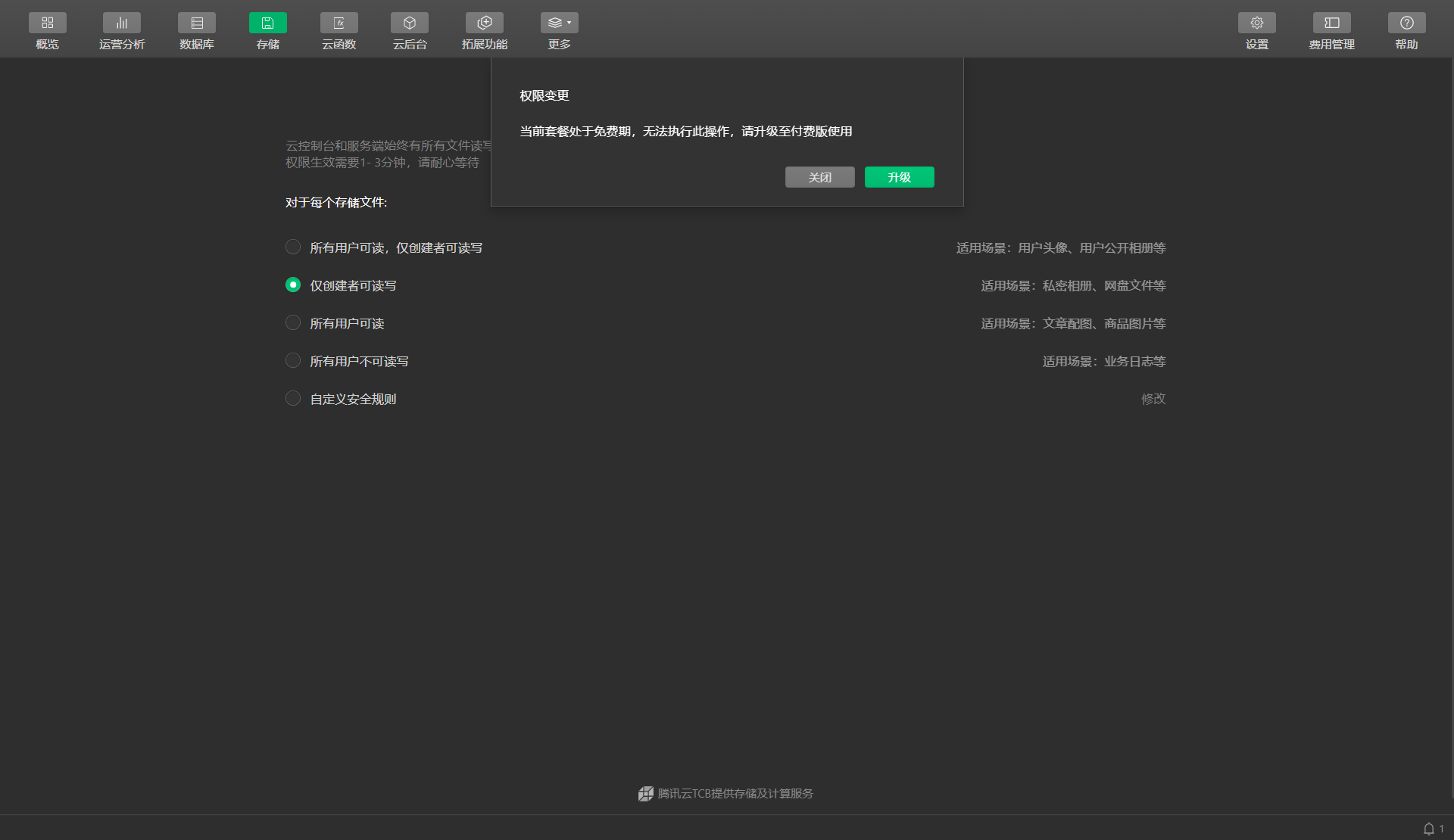 我在云开发后台上传了图片,但在小程序端报500,且无法修改云存储的访问权限,意思是体验版的云开发无法使用云存储图片吗?