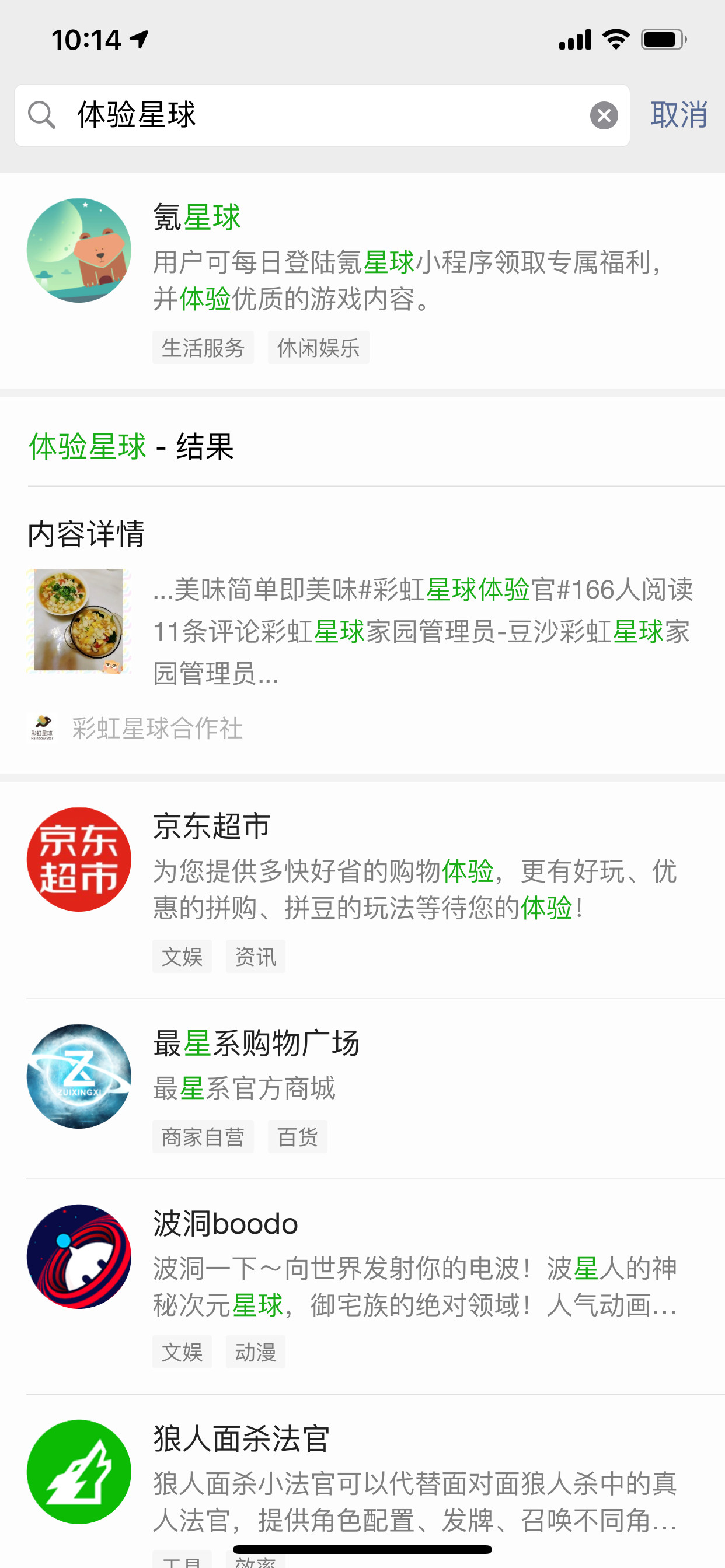 小程序名称:体验星球旅行服务,小程序简称:体验星球。在小程序搜索页面,输入“体验星球”搜索,均无结果(如下图)。请问下我们小程序中包含“体验星球”关键词,为什么没有命中输出结果?