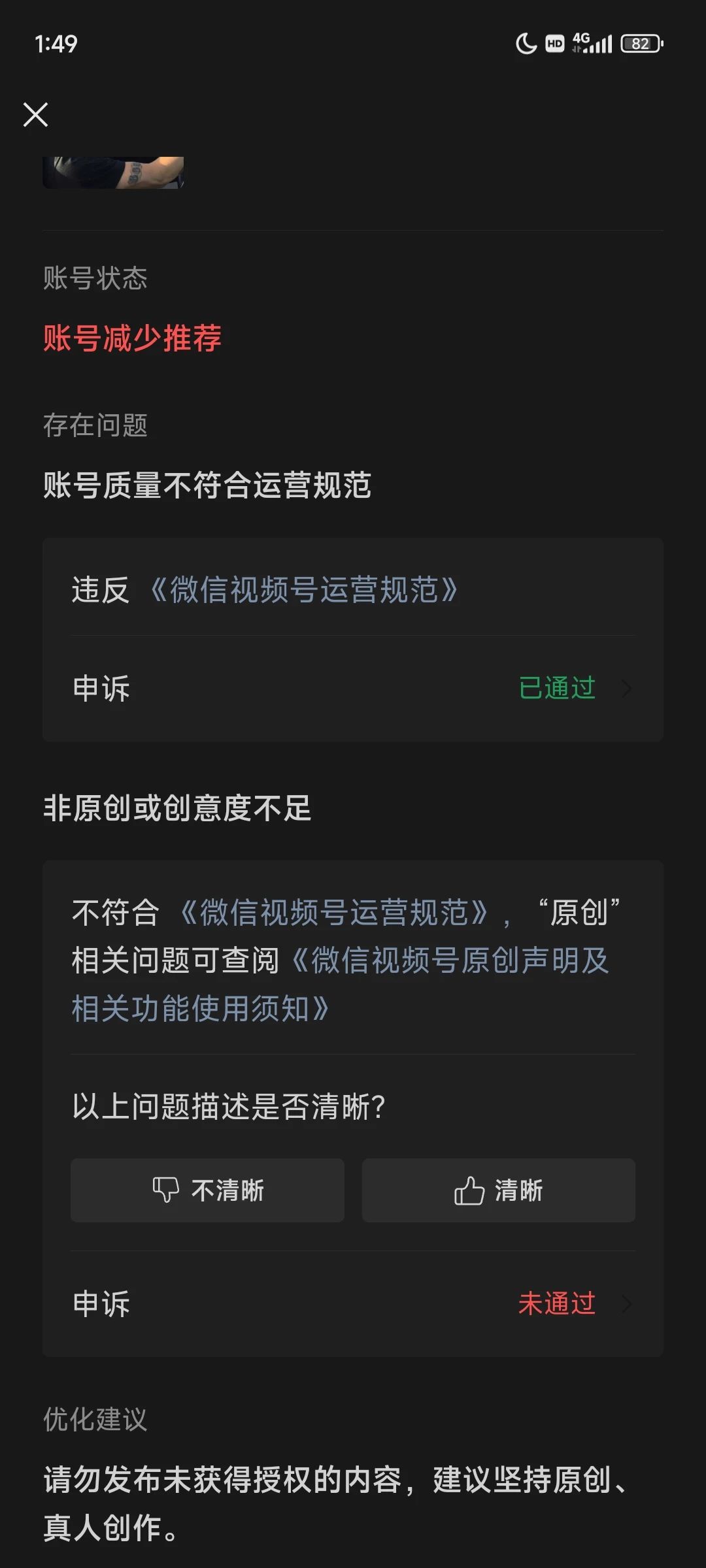 之前封了广告分成,就整改了一次,质量问题申述通过了,原创问题直接减少推荐,也没给个具体时间,只是说优化后才可以解。