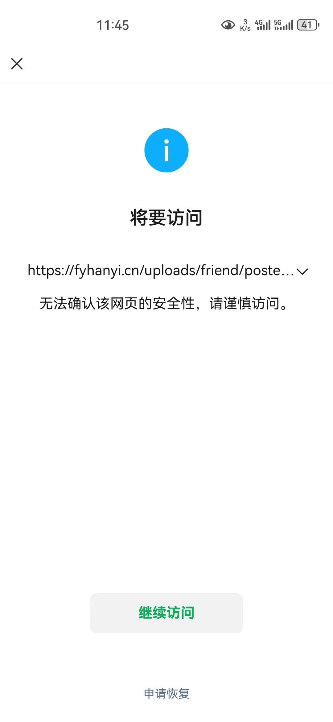 您好,普通二维码跳转规则地址(https://fyhanyi.cn/uploads/friend/poster/),域名已备案通过,浏览器访问正常