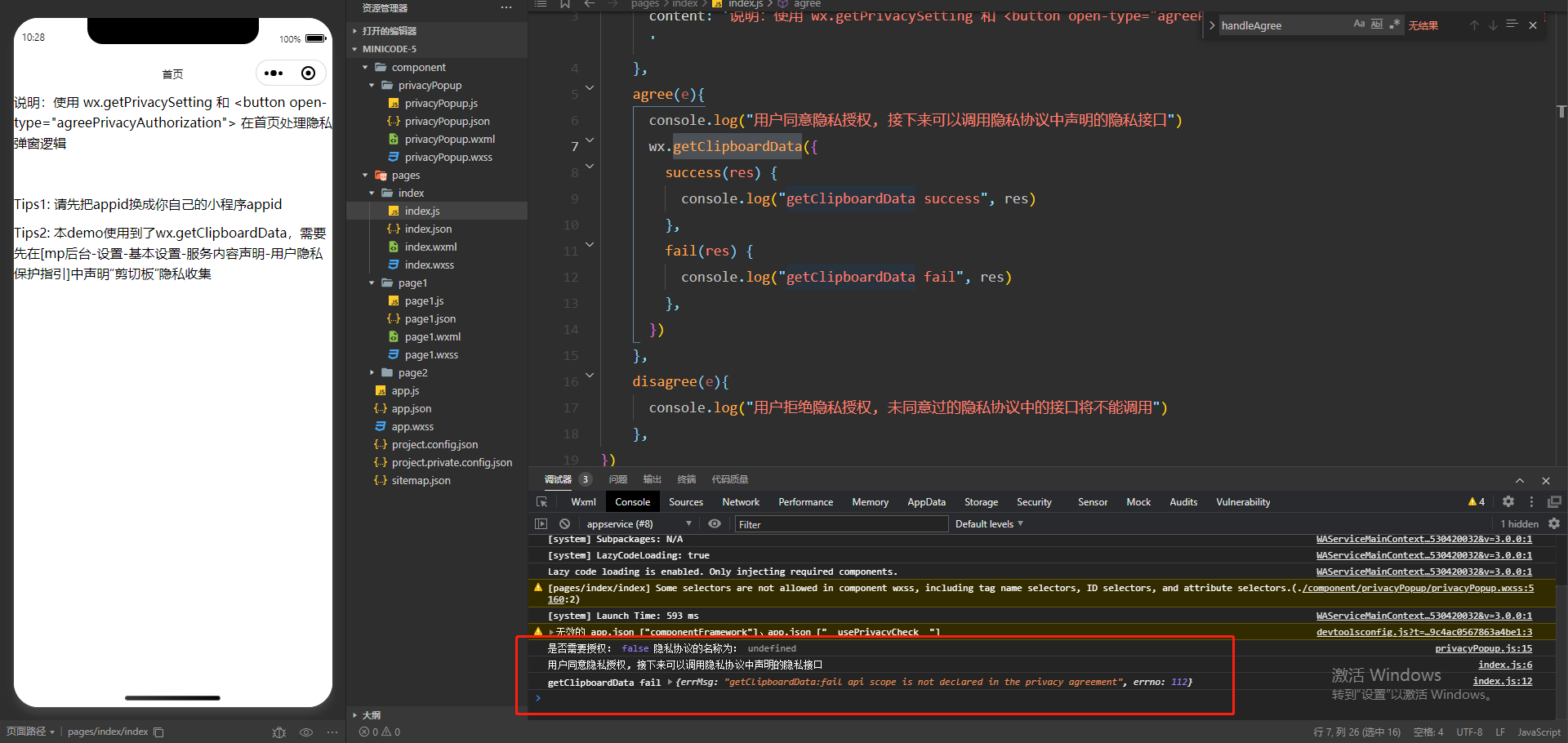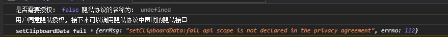 官方的小程序隐私协议开发指南中,demo1演示里一样提示{errMsg: "getClipboardData:fail api scope is not declared in the privacy agreement", errno: 112}