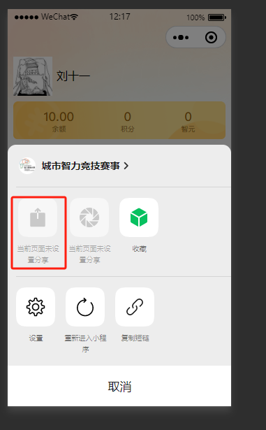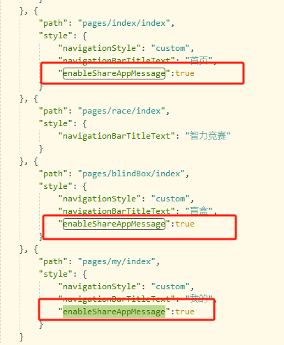配置和代码如图,智力竞赛和我的2个页面的分享都是灰色的,请问应该怎么配置?