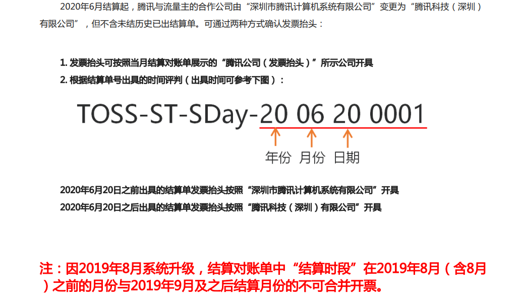 2020.07月及之前是按照个体工商户出具的结算单,需要按照个体工商户开票,腾讯公司将会在收到正确无误的发票及结算单后的30个工作日内打款至对公账户。(注:2020.05月及之前月份的总结算单金额可以合并开一张专票,发票抬头为“深圳市腾讯计算机系统有限公司”,需开具“深圳市腾讯计算机系统有限公司”的相关信息;2020.06月-2020.07月总结算单金额可以合并开一张专票,发票抬头为“腾讯科技(深圳)有限公司”,需开具“腾讯科技(深圳)有限公司”的相关信息。)