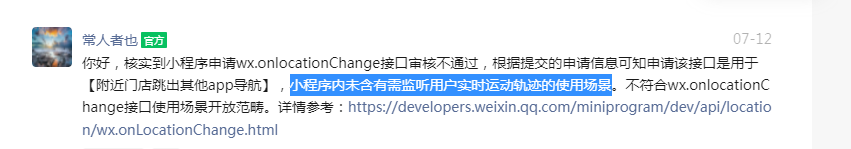 你好,核实到小程序申请wx.onlocationChange接口审核不通过,根据提交的申请信息可知申请该接口是用于【计算与门店的距离以及跳出其他app导航服务】,小程序内未含有需监听用户实时运动轨迹的使用场景。不符合wx.onlocationChange接口使用场景开放范畴。详情参考:https://developers.weixin.qq.com/miniprogram/dev/api/location/wx.onLocationChange.html