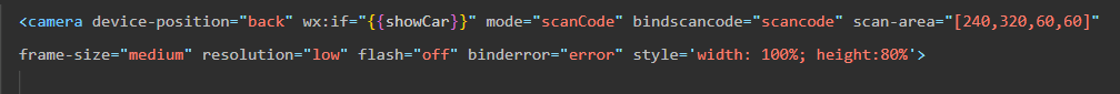 <camera class="camera" bindscancode="onCodeReceived" mode="scanCode" scan-area="[30,0,375,300]" style="width: 100%; height: 800px;"></camera>
