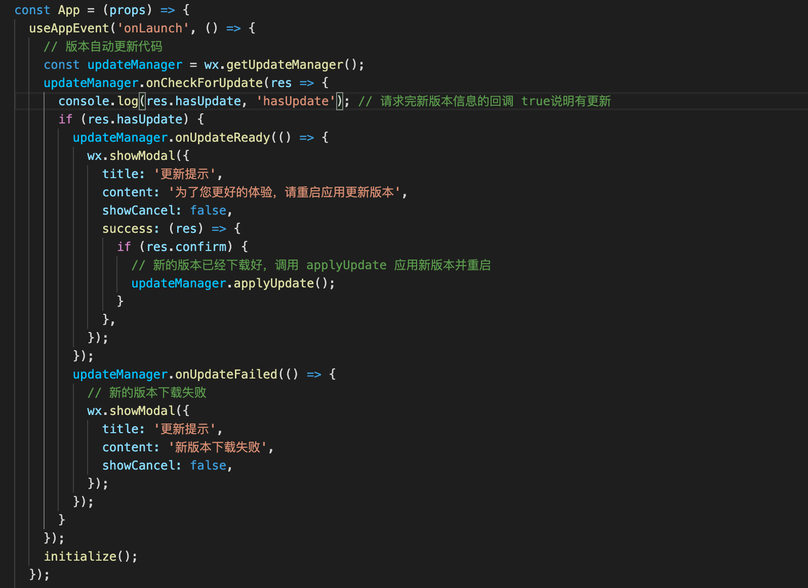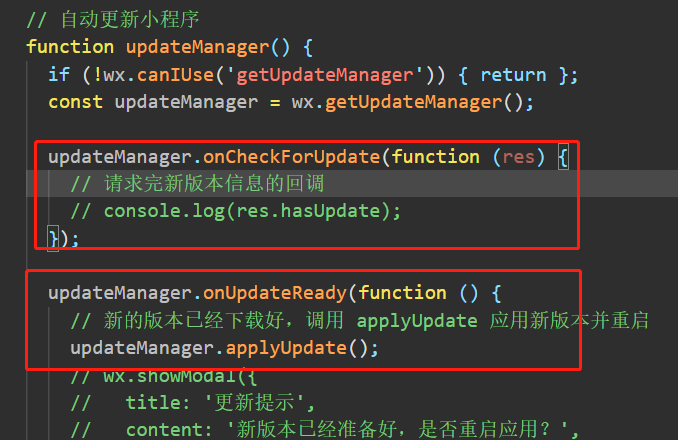 你可以试试我这样,updateManager.onCheckForUpdate和updateManager.onUpdateReady可能是异步执行的,不是同步的,所有要分开监听。这样写我每次发布小程序会提示我更新