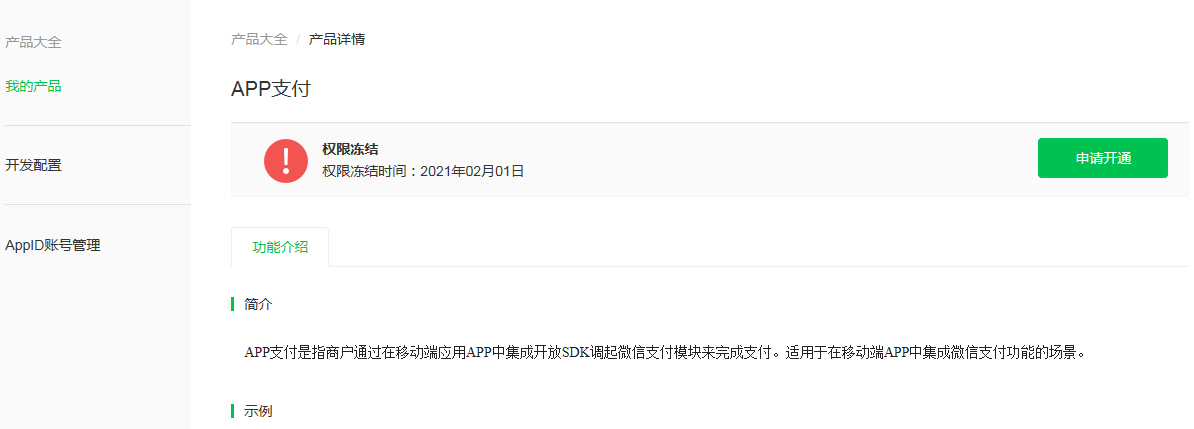 进入商户平台,产品中心查看,就看到APP支付和H5支付被冻结了,点击APP支付,然后审开通,确显示一片空白是为什么呢