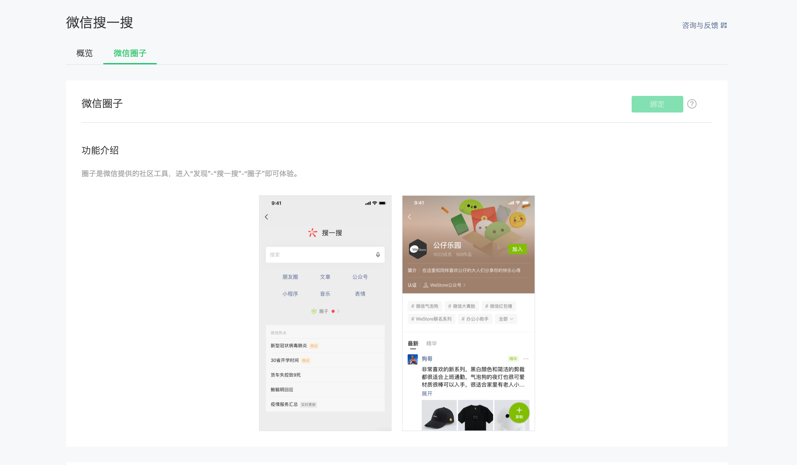 2.以上问题是否因为公众平台的微信搜一搜中没有绑定圈子小程序?但是我们的“绑定”按钮不可用是何原因?