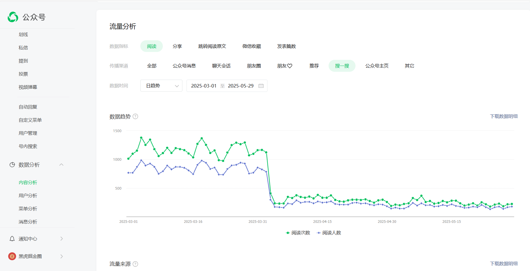 这时的我一直在想:到底是什么原因导致公众号流量断崖式下滑,而且还是搜一搜流量断崖式下滑?是自己因为断更了一天内容导致的流量断崖式下滑吗?是最近公众号文章写的质量低吗?是腾讯搜一搜出现AI自动回复导致的吗?是有人恶意举报导致的吗?