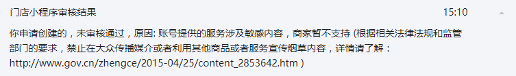 门店小程序申请信息中都没涉及敏感内容(烟草),怎么审核说有敏感内容(烟草),不通过