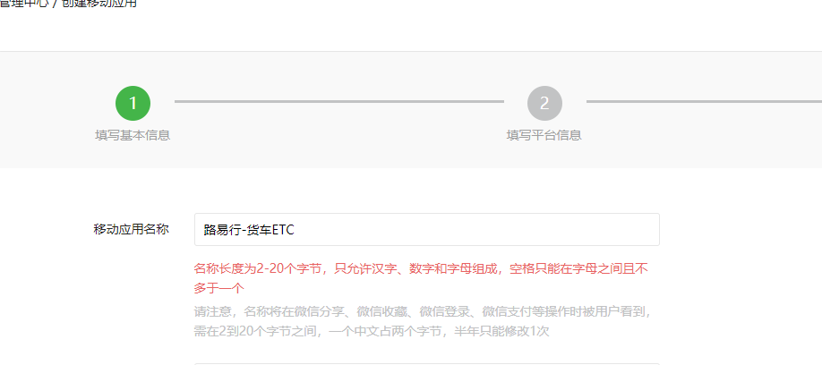 问题:开始已经提交了移动应用已过审,但是没有提交到应用市场。现在APP已经上架到AppStore,但是App应用名字进行了修改,提审不过。现在AppStore市场的名字为“易行通-货车ETC”,但是开放平台移动应用中,不能存在-,请问有什么解决方法?开放平台应用名称改为“易行通货车ETC”?