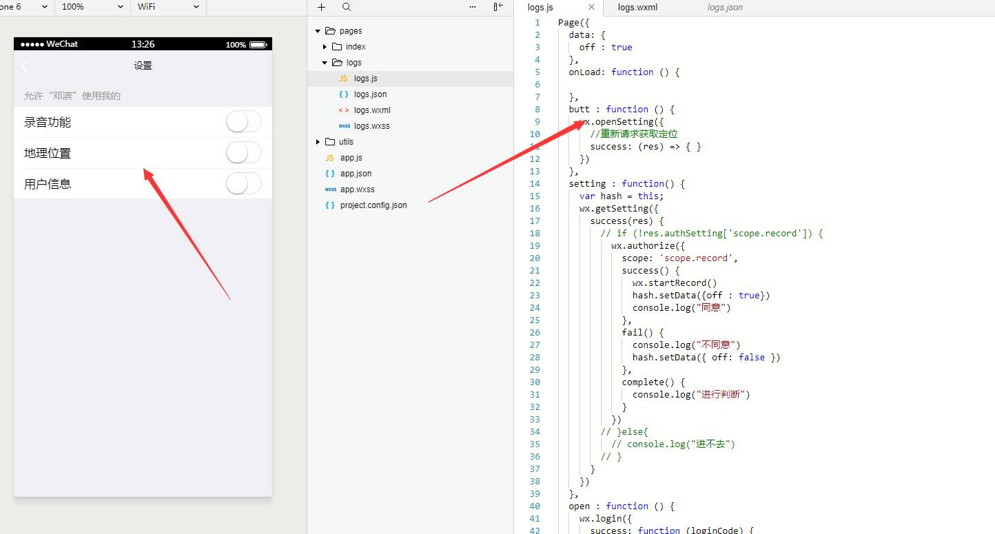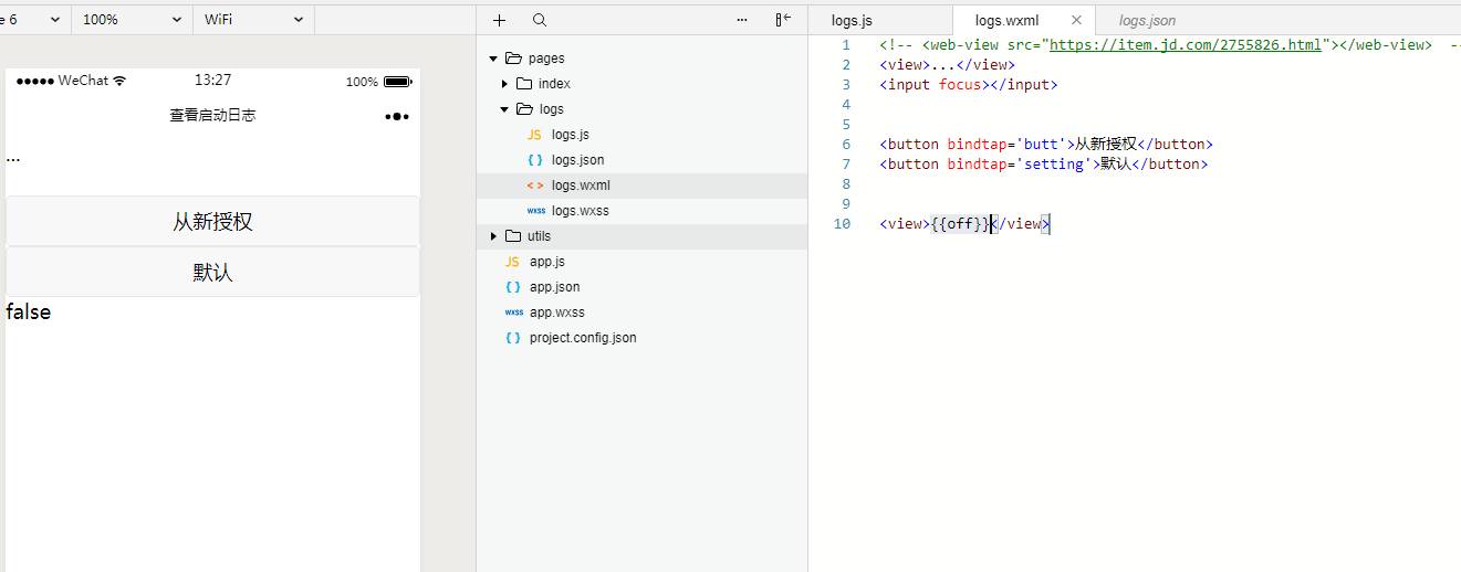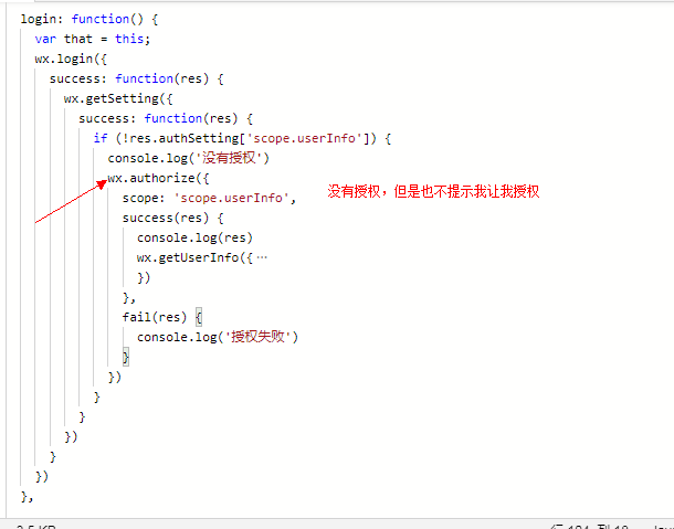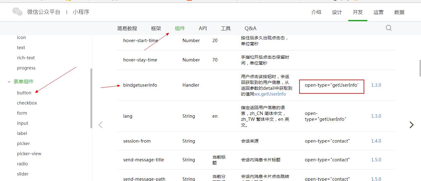 <button bindgetuserinfo="handleClick(自定义的方法)" open-type="getUserInfo">授权</button>![]()