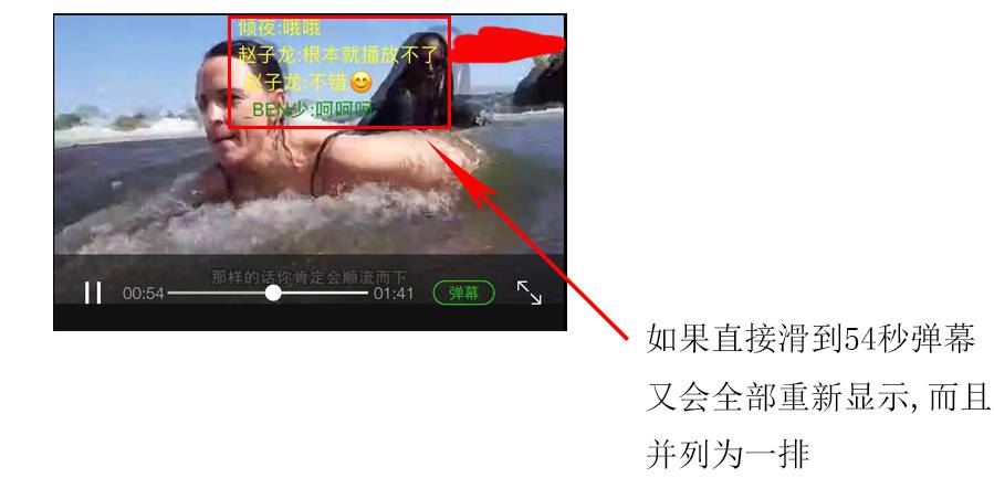 滑动到开始后,如果直接滑动到其它时间,弹幕又会全部重新展示,而且并列为一排,