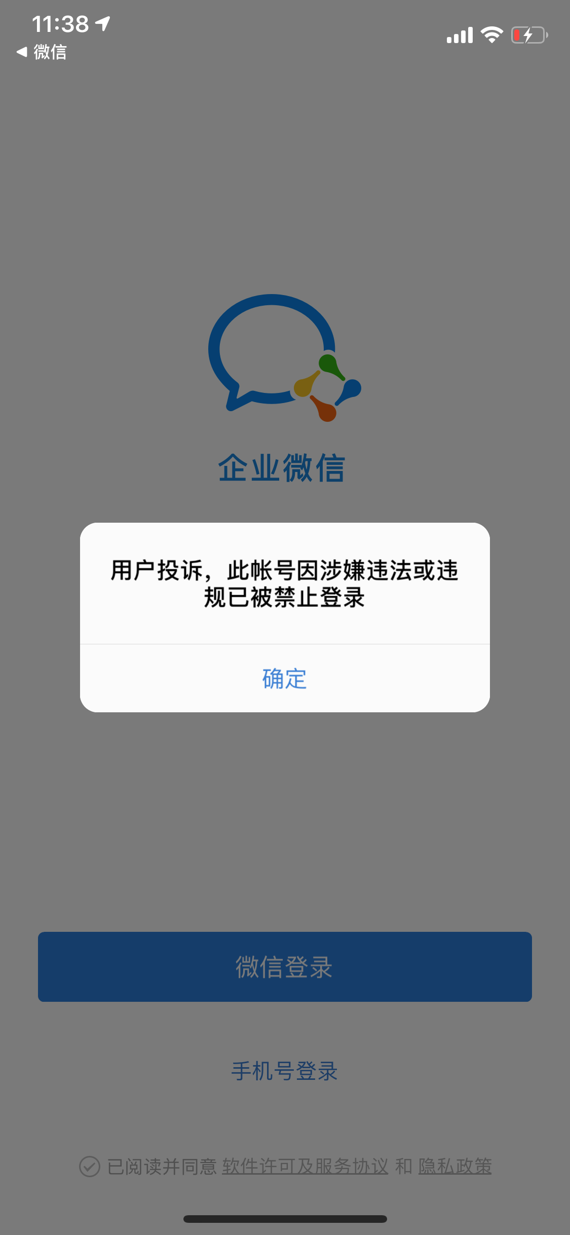 6月16日,企业微信突然自动下线,当我再次登陆的时候,提示:“用户投诉,此账号因涉嫌违法或违规已被禁止登陆”,随后所有人无法登陆,也无法进行管理,打卡什么的!也就意味着,企业微信彻底不能用了!随后我联系官方客服【没有电话客服,只能通过公众号进行联系】。