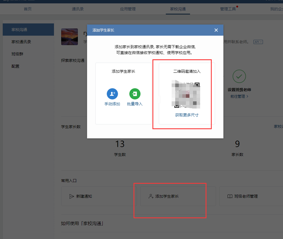 你好,需要登录管理端,扫码 进入学校通知,添加家长到通讯录,才能正常进入