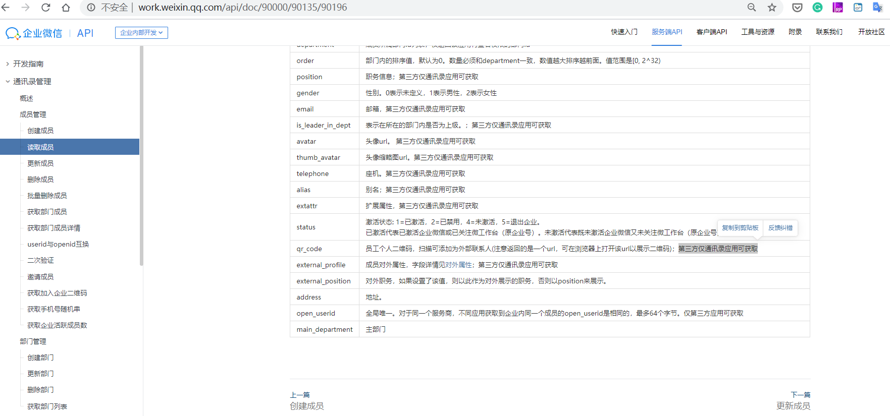 您好,员工二维码属于用户的敏感信息,目前只有企业本身和第三方通讯录应用能够获取,第三方普通应用调用读取成员接口不会返回,如需要获取用户的二维码,可以通过构造授权链接来获取https://work.weixin.qq.com/api/doc/90001/90143/91120