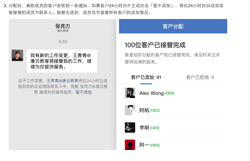还有一个问题,客户分配之后如何和企业自身的CRM系统打通。即一个员工离职了,其客户有可能被分配给若干交接人。那么在CRM里面,需要手工再去一一分配给交接人。