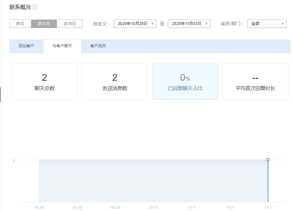 你好,需客户发起会话时,成员进行了回复,才会统计“已回复聊天占比”、“平均首次回复时间长”这两个数据