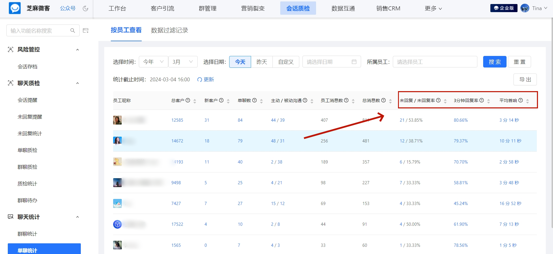 如您想具体查看,可以通过企业微信的服务商芝麻微客单聊统计功能进行查看。芝麻微客系统的【聊天统计】功能支持按日期查看、按员工查看客户消息的回复情况、以及回复率等,可以帮助企业更好地分析客户接待中存在的问题。