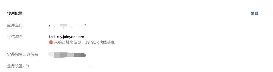 你好,配置的第三方应用oauth2授权链接,授权企业是需要安装这个第三方应用,现在看你这个第三方测试地址的可新域名是test-api.joinyen.com,跟上面的test-my.joinyen.com 这个是不一致的