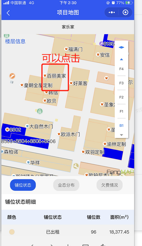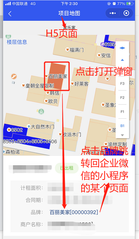 3、在H5页面点击地图的某个店铺(地图可以放大),打开弹窗;